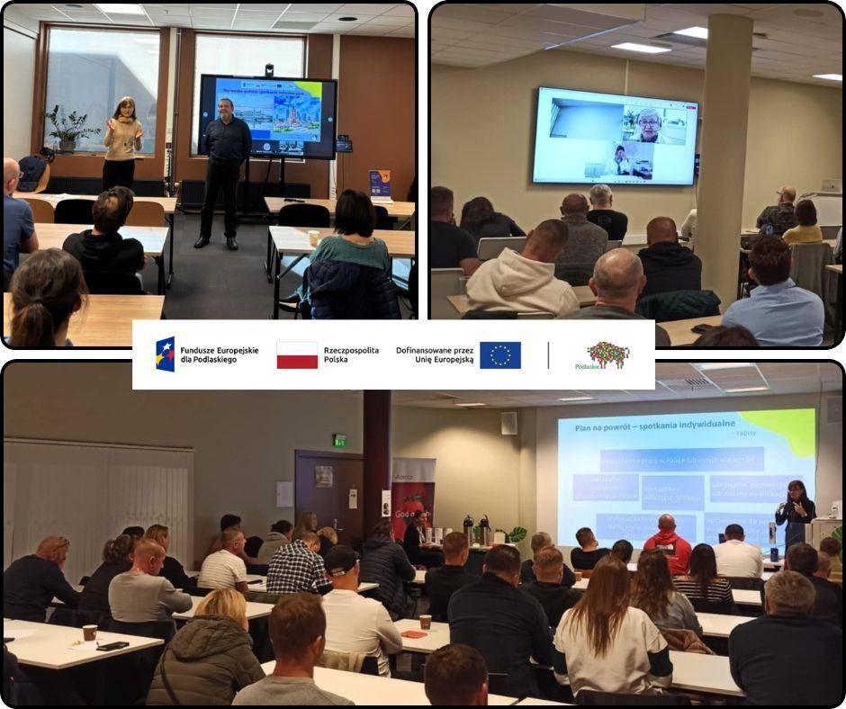 Podczas spotkań zostały przedstawione sposoby poszukiwania pracy na polskim rynku pracy (przydatne strony internetowe i portale publikujące oferty pracy), podstawowe informacje dotyczące zaliczania okresów zatrudnienia za granicą do uprawnień emerytalno–rentowych, niezbędne dokumenty do ustalania świadczeń z tytułu bezrobocia, które warto zabrać przy wyjeździe z Norwegii oraz praktyczne wskazówki, związane z powrotem (m.in. portal Powroty). W spotkaniu wzięli udział: specjalistki z Oddziału Zakładu Ubezpieczeń Społecznych w Białymstoku oraz pracownicy Wydziału Rynku Pracy oraz Centrum Informacji i Planowania Kariery Zawodowej tut. Urzędu.